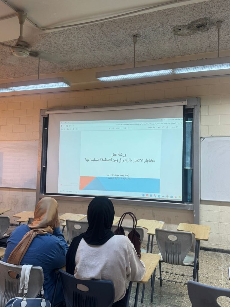 The workshop was delivered by the Unit’s Director, Dr. Israa Abdul Ali Kazem, along with liaison member Dr. Mohammed Khalil Ahmed. It addressed key concepts related to the crime of human trafficking and highlighted how authoritarian regimes exacerbate this phenomenon by weakening the rule of law and exploiting vulnerable groups.