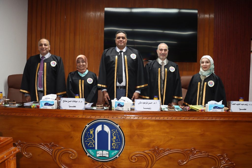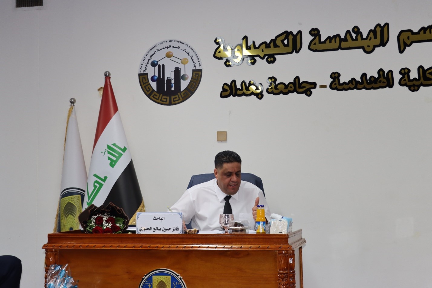 The College of Engineering, University of Baghdad, held the public defense of the master’s student Faiz Hussein Saleh Mahdi in the Department of Chemical Engineering for his thesis entitled ” application of air sparging technique in pressure driven membranes ” on Sunday, September 7, 2025, in the hall of Prof. Dr. Mahmoud Omar, under the supervision of Prof. Dr. Ahmed Faiq Hassan Al-Alawi. The defense committee consisted of Prof. Dr. Hassan Farhoud Makki as (Chairman), Asst. Prof. Dr. Zainab Abdul Majeed Khalaf as a (member), and Asst. Dr. Miqat Hassan Saleh as a (member). The study investigated the effect of air sparging techniques to enhance the performance of the water desalination process using reverse osmosis (RO), nanofiltration (NF), and ultrafiltration (UF), which are considered important membrane technologies for water treatment that improve the permeate flow and sodium chloride rejection and Removing crude oil from water using hollow fiber ultrafiltration. A helical membrane unit from reverse osmosis, a thin composite membrane made of polyamide, and hollow fibers of polyvinyl chloride were used as membranes for reverse osmosis, nanofiltration, and ultrafiltration, respectively. The results showed high flux and high rejection rates. After discussion, the committee awarded the student Faaiz Hussein Saleh a Master’s degree in Chemical Engineering.