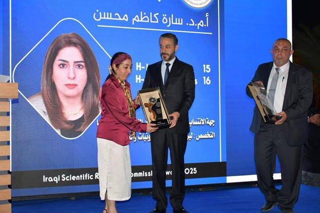 As part of the activities of the Iraq Higher Education Conference 2025, Asst. Prof. Dr. Israa Abdulwahab Hammoudi, a faculty member in the Civil Engineering Department at the University of Baghdad, received the Research Innovation Award during the ceremony honoring the winners of the Science and Leadership Day Awards, organized by the Scientific Research Authority under the patronage and presence of the Minister of Higher Education and Scientific Research, Dr. Naeem Al-Aboudi.